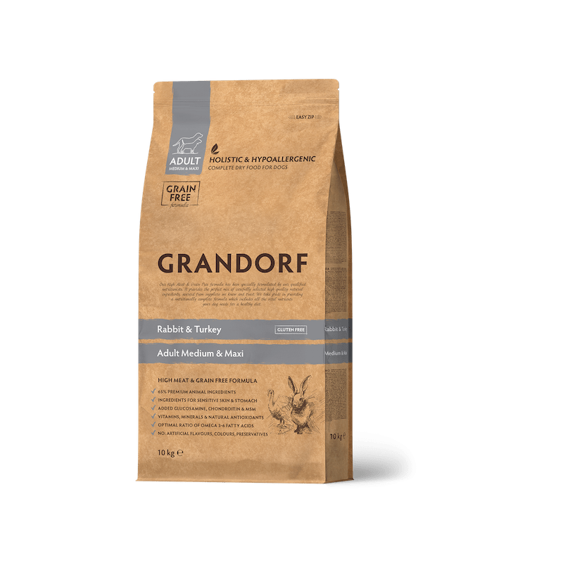 Grandorf Jäneseliha ja Kalkuniliha kõikidele keskmist kasvu ja suurtele koertele. Alates 1. eluaastast. Suurepärane alternatiiv teraviljaga toitudele, sobib ka allergikutele ja tundliku seedimisega koertele.